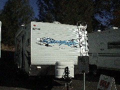 Rampager Model 240 - 27' 6" Way Lite Toy Hauler Model 240W ALJO RAMPAGE Way-Lite 27'6" Travel Trailer (Or NOMAD or LAYTON TT by Skyline. This new model is like no other. The fold away seating and dinette convert for sleeping. . There is also a diamond plate stone guard in front. Also on the front is the roof ladder. The high-tech ammenities include a fueling station and 4.0KW Onan Generator. There's an electric 'magic' bunk over the fold-up rear ramp making this lightweight sleep eight. Chrome wheels, awning - lots of lighting finish it off.